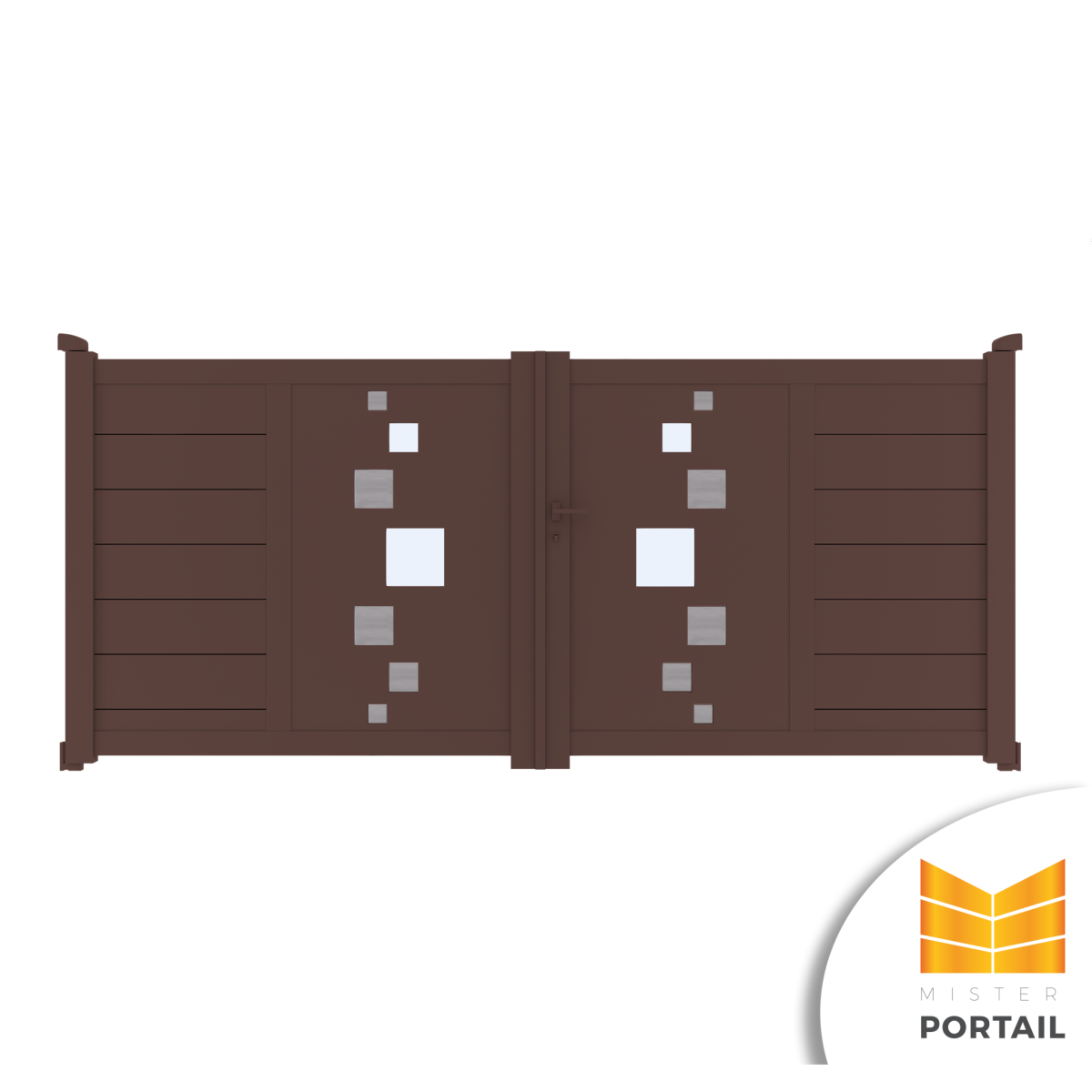 -Panneau double feuille Aluminium en Mousse Extrudé de 20mm d’épaisseur si portail présenté avec panneau décoratif Alu Brossé, Tôle perforée, Tôle découpe Laser, Vitrage Acrylique opaque.