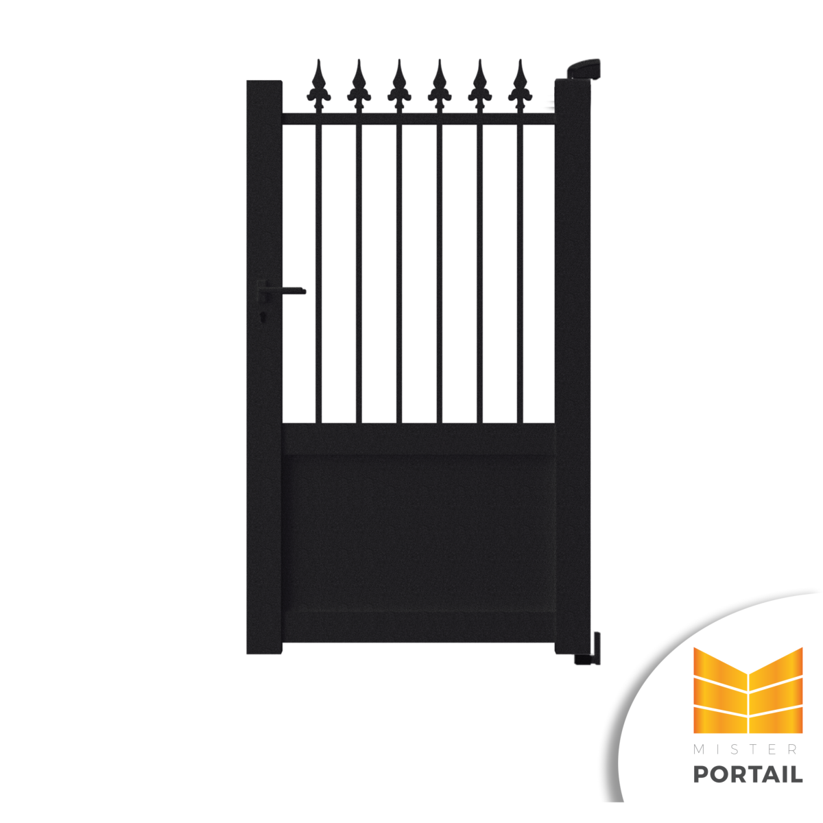 Le portillon alu Tradition ULMO semi-ajouré, de forme droit lui donne un aspect moderne. Il est constitué de barreaudage vertical en partie haute et d'un soubassement en tôle simple d'aluminium de 2mm.